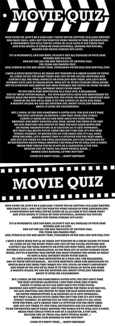SAW / SOME LIKE IT HOT / ICE AGE / DIRTY DANCING / EASY RIDER / TRAINSPOTTING HOCUS POCUS / TITANIC / STIR CRAZY /GONE WITH THE WIND / 9-5 / 48HRS / GET OUT /FINAL DESTINATION / ET / UNFORGIVEN /POINT BREAK / CIRCLE / GLADIATOR / TOP GUN 24HR PARTY PEOPLE / HERBIE GOES BANANAS